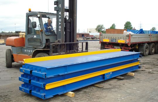 Электронные автомобильные весы модели ВСА-Р – это современные, модульные, разборные автовесы колейного типа для статического взвешивания грузового транспорта (грузовиков, прицепов, полуприцепов, цистерн, карьерной техники и других машин) с полным заездом на грузоприёмную платформу. Грузоприёмная платформа автовесов состоит из набора модулей, соединённых межу собой балками, передающими нагрузку на тензометрические датчики. Тензодатчики через коробку и сигнальный кабель передаю сигнал на весовой терминал. За счёт модульности конструкции длина варьируется от 6 до 26,3 м, легко транспортируется и монтируется. Особая ортотропная конструкция с сотовой структурой обеспечивает автовесам серии ВСА-Р высокую жёсткость грузоприёмной платформы, большой запас прочности и высокую точность измерений, что позволяет применять их на промышленных предприятиях и строительных объектах с большим грузопотоком и интенсивностью взвешивания. Весы производятся как для бесфундаментного, так для фундаментного монтажа. Для бесфундаментной установки весы монтируются на любую ровную и твёрдую поверхность и комплектуются различными вариантами установочных комплектов в зависимости от площадки и задач заказчика. При установке на фундамент весы монтируются по проекту на подготовленное бетонное основание.
